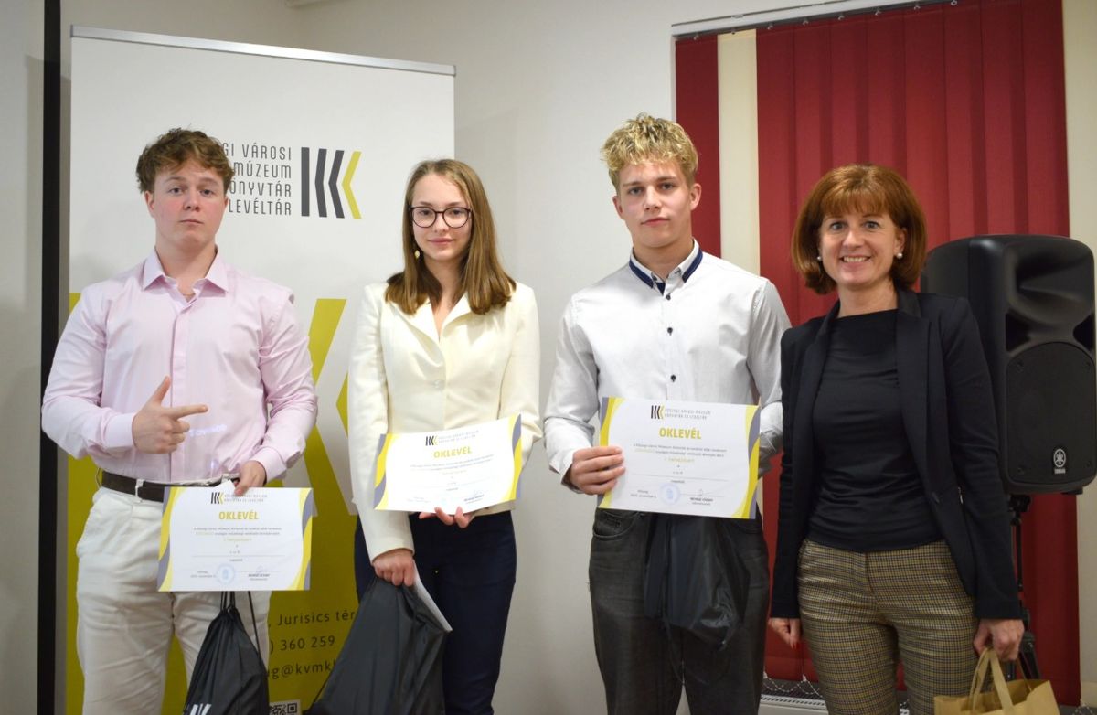 A középiskolások versenyének 1. helyezettje: TMF, a szombathelyi Vas Vármegyei SZC Kereskedelmi és Vendéglátó Technikum és Kollégium csapata, tagjai Kóczán Réka, Nagy Miklós Antal, Németh Levente és felkészítő tanáruk, Szita Szilvia. Forrás: KVMKL